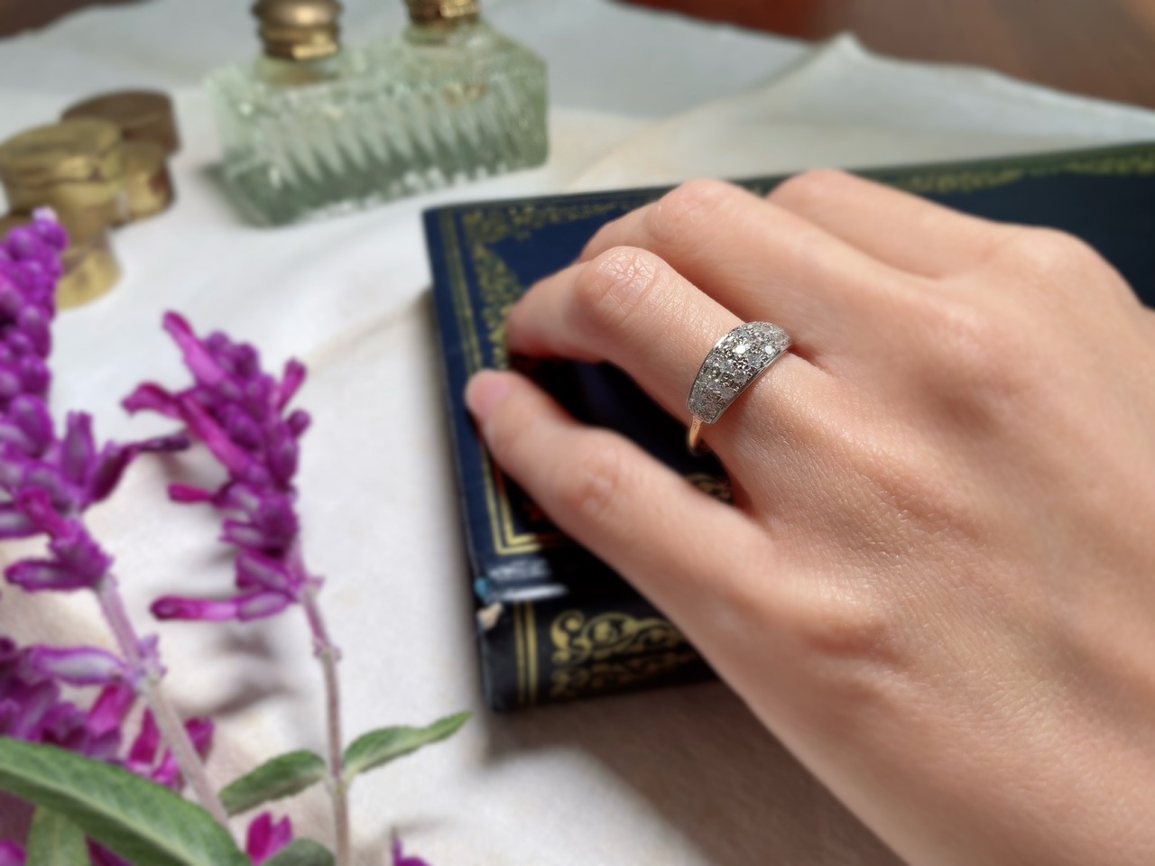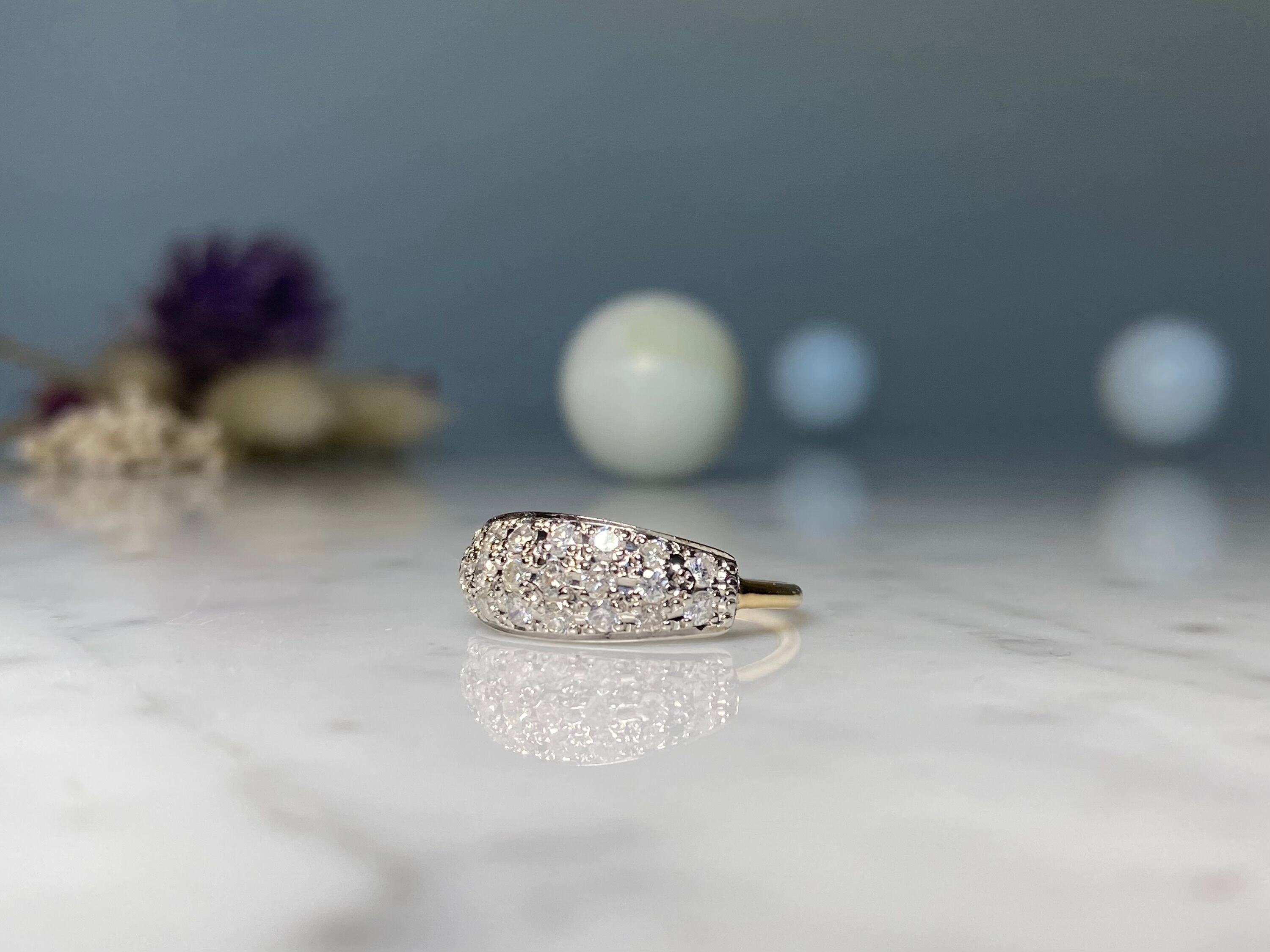 K18YGの華奢なアームに、ドーム状のパヴェを合わせた煌めきが魅力的なリング。